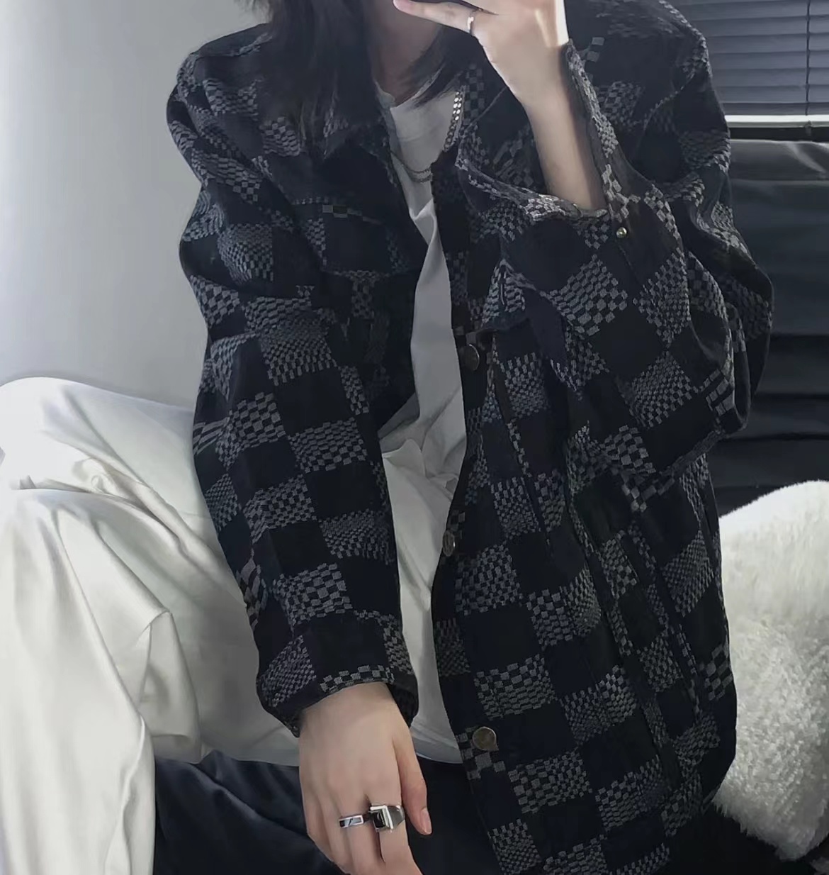 碁盤の目ジャカード柄は、クラシックでありながらも洗練された魅力を引き立てます。コーディネートを選ばず、様々なスタイルにマッチするアイテムです。